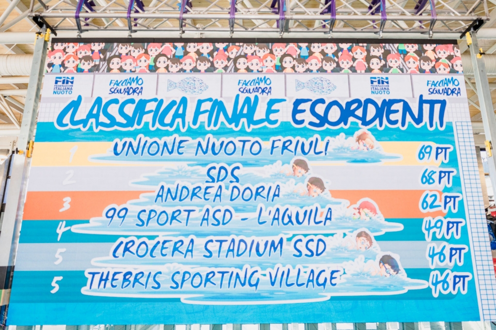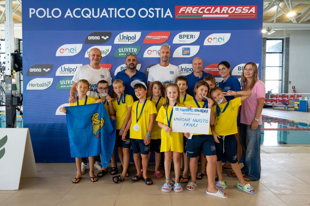Si è concluso nella giornata di ieri il Trofeo “Facciamo Squadra” al Centro Federale di Ostia, l’evento ha visto la partecipazione di atleti tesserati Propaganda delle categorie esordienti e giovanissimi. La Società Unione Nuoto Friuli (foto Federazione Nuoto) ha conquistato il primo posto della manifestazione con 69 punti per la categoria esordienti e settimi in in quella giovanissimi.